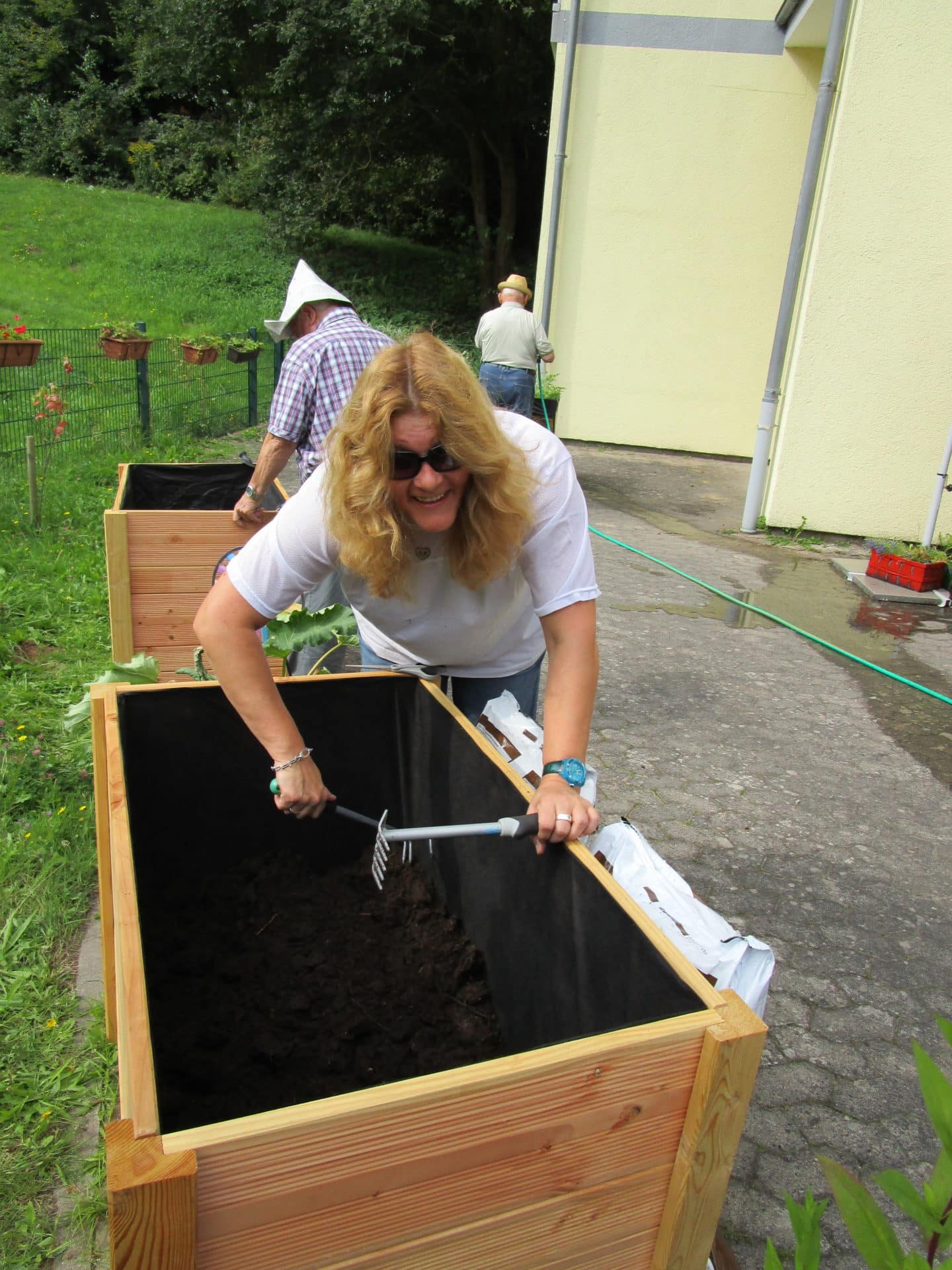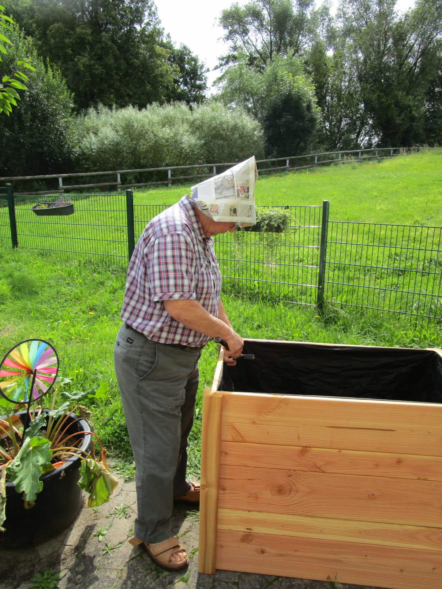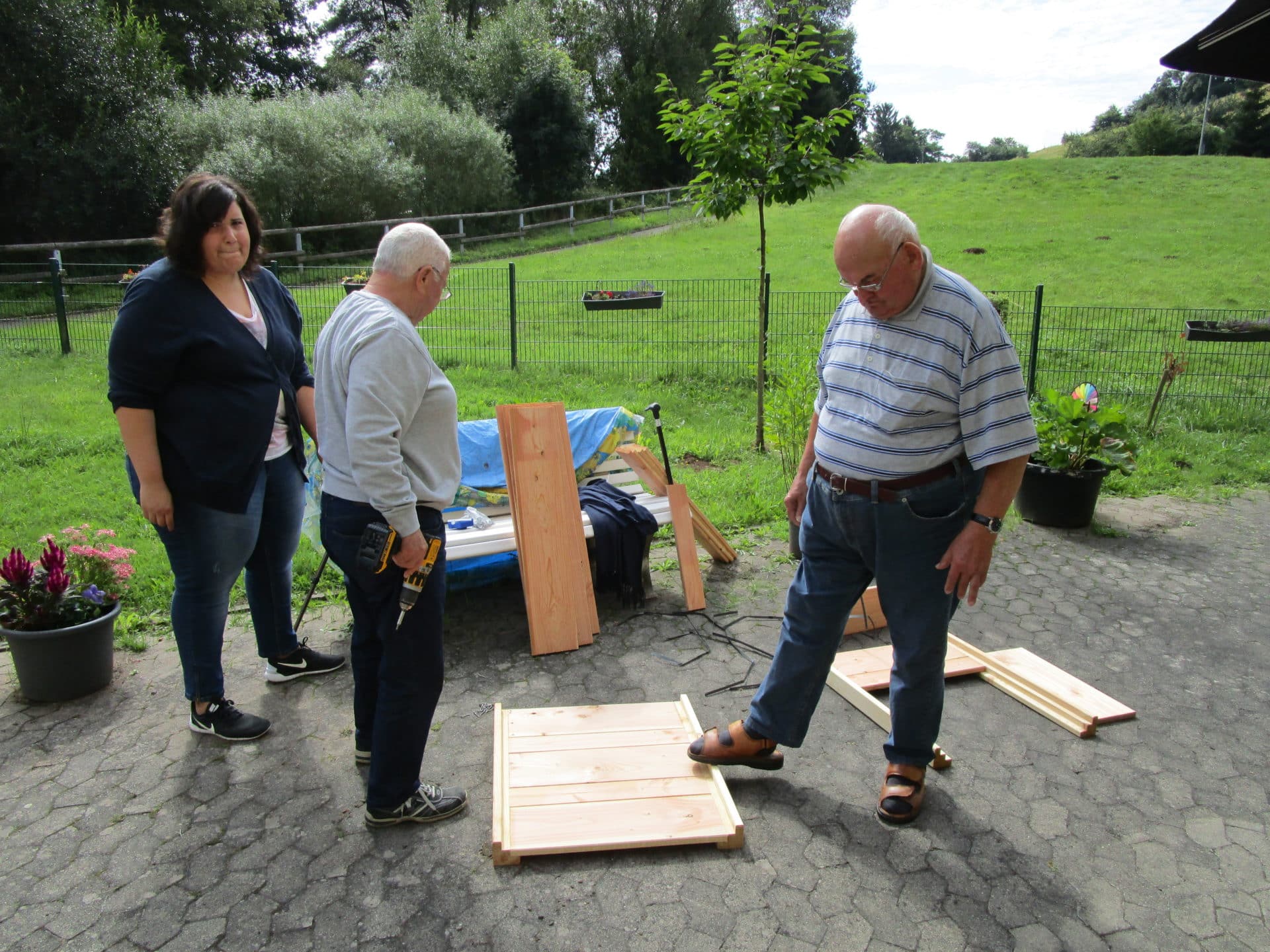 Wir bekamen zwei Hochbeete gesponsert. Die Aufbauanleitung wurde studiert und unsere Männer bohrten und hämmerten was das Zeug hielt. Natürlich hatten die Damen alles im Blick, denn sie waren ja immerhin für das spätere Bepflanzen zuständig.