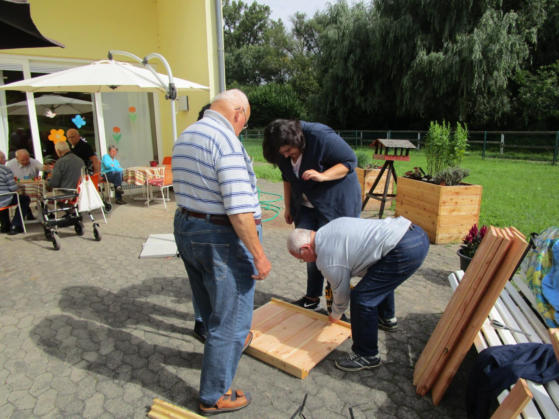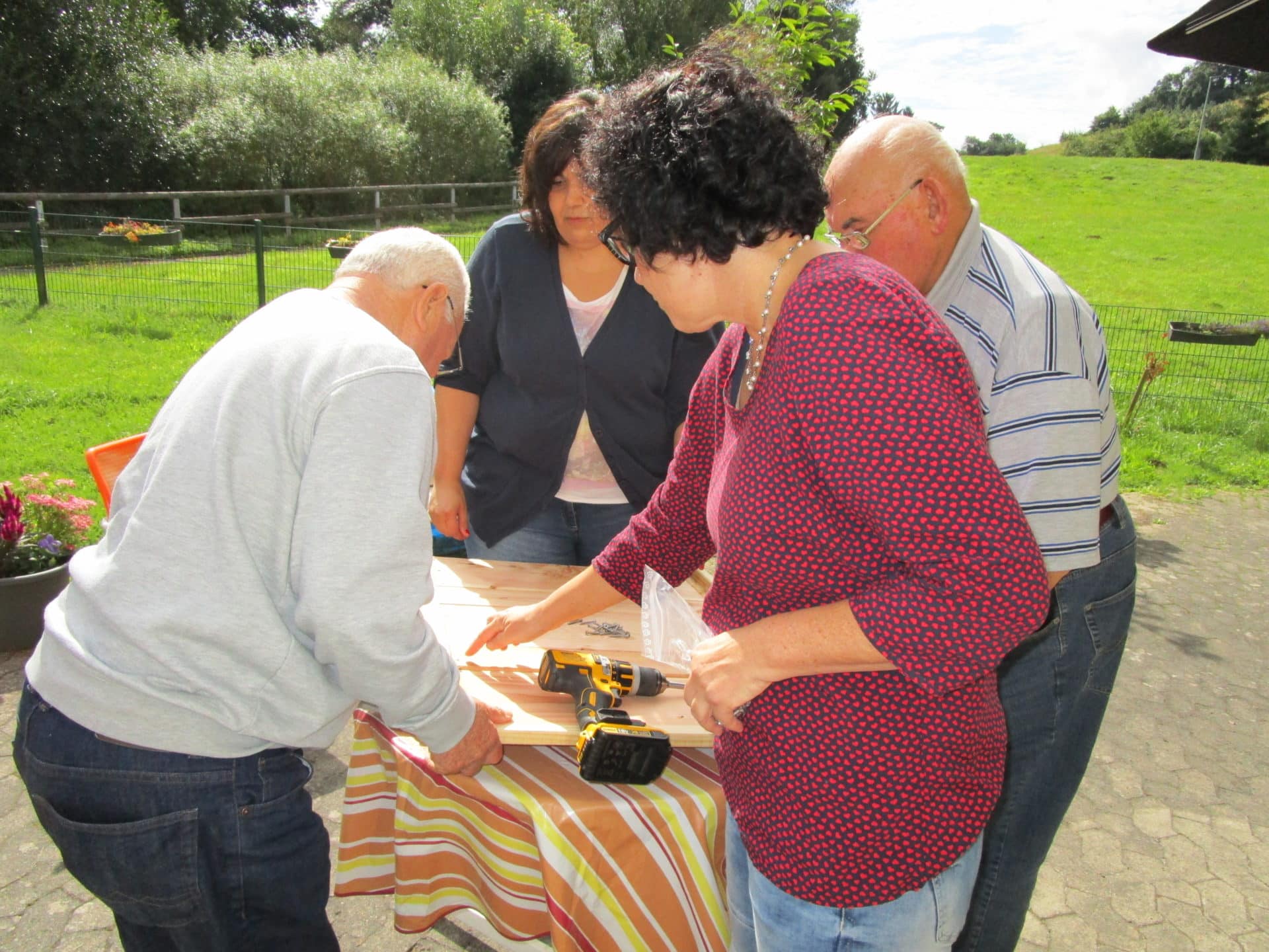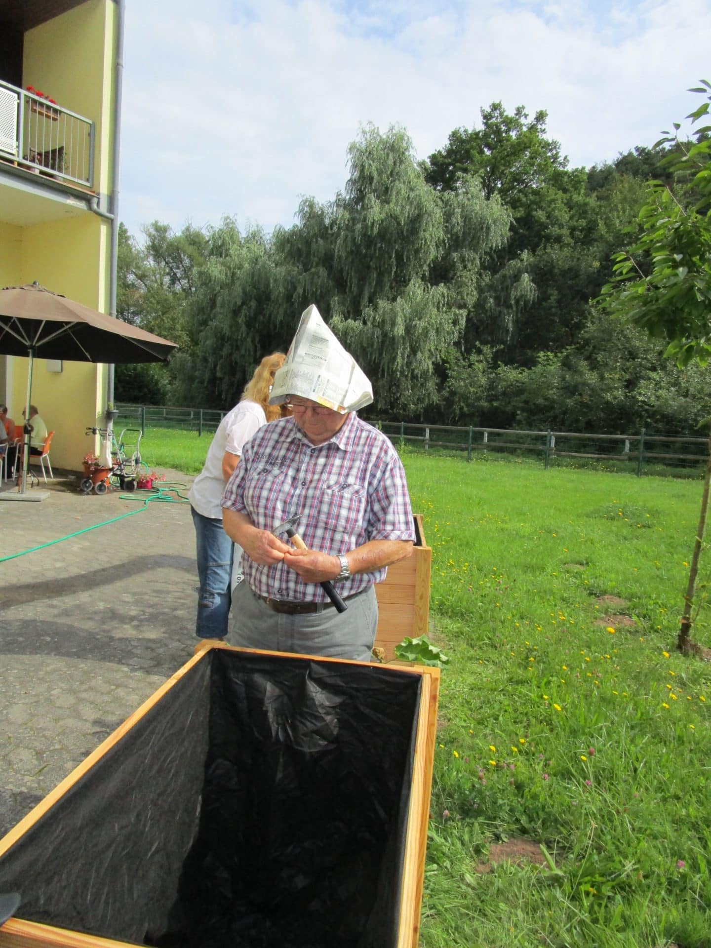 Wir bekamen zwei Hochbeete gesponsert. Die Aufbauanleitung wurde studiert und unsere Männer bohrten und hämmerten was das Zeug hielt. Natürlich hatten die Damen alles im Blick, denn sie waren ja immerhin für das spätere Bepflanzen zuständig.