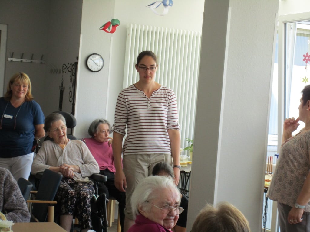 Fröhlichkeit, lautes Kinderlachen – was war los bei uns im MennoHeim? Die Kindergartengruppe vom Haus Regenbogen hatte uns wieder einmal besucht. Die Kleinen kamen mit ihren Erzieherinnen bei uns vorbei, um ein kleines Programm vorzustellen.