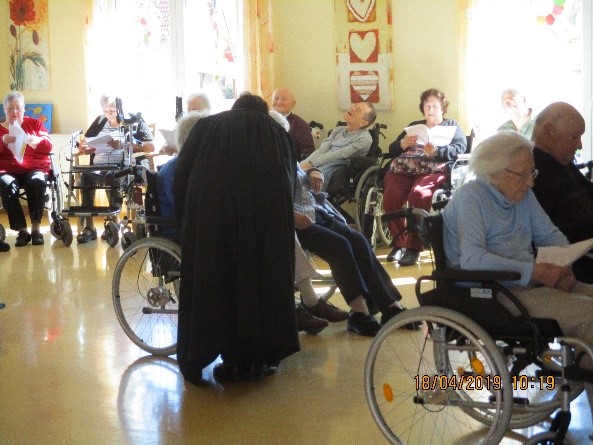 Am Gründonnerstag, 18.04.2019, hielt Frau Prädikantin Breitwieser für unsere BewohnerInnen einen feierlichen Ostergottesdienst mit Abendmahl.Der Gottesdienst war gut besucht. Alle verfolgten aufmerksam die Predigt und beteiligten sich kräftig am Gesang der Lieder.