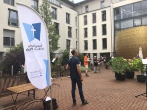 Am Samstag, den 01. August 2020 um 11:00 Uhr, fand in unserem Diakonissenhaus am Stadtpark ein Bläserkonzert unter dem Motto „Corona durchkreuzen – querblech durch die Pfalz“ statt. Unter diesem Motto bieten Bläsergruppen evangelischer Posaunenchöre derzeit vor Senioren- und Pflegeheimen, auf öffentlichen Plätzen und vor Kirchen Ständchen für einen guten Zweck.