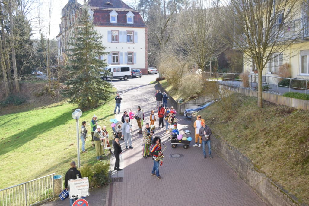 Am Fastnachtsdienstag überraschten uns die Musiker und Kinder der Fastnachtstruppe der KVK Enkenbach mit bunten Kostümen und gestalteten ein schönes Hofkonzert mit verschiedenen Stimmungsliedern.
