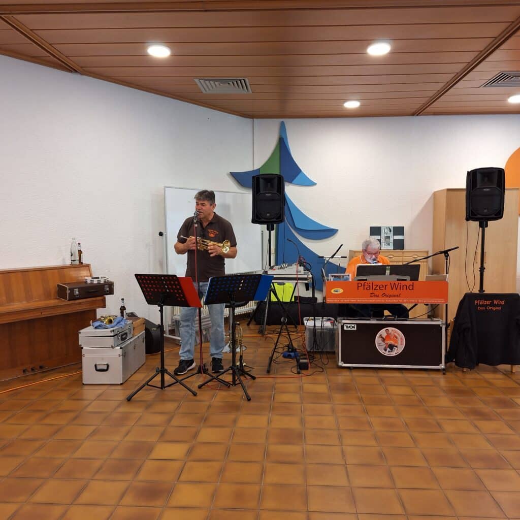 Mit viel Liebe wurde der Speisesaal geschmückt: blau-weiße Girlanden, Herbstblumen und leuchtende Lichter sorgten für ein stimmungsvolles Ambiente. Für die zünftige musikalische Unterhaltung sorgte die Gruppe „Pfälzer Wind“, für beste Laune und echte Wiesn-Atmosphäre.