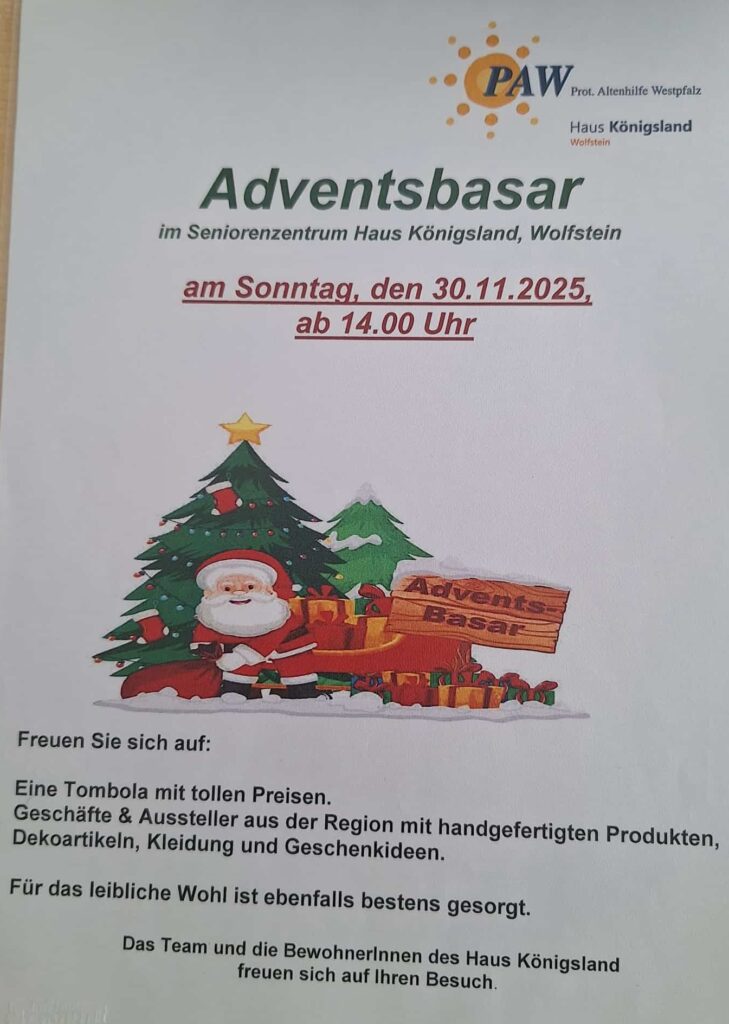 Am 30. November 2025 ab 14:00 Uhr laden wir Sie herzlich zum stimmungsvollen Adventsbasar im Haus Königsland in Wolfstein ein. Freuen Sie sich auf einen gemütlichen Nachmittag voller vorweihnachtlicher Atmosphäre, liebevoller Begegnungen und vieler schöner Überraschungen gemeinsam mit unserem Team und unseren Bewohner:innen.