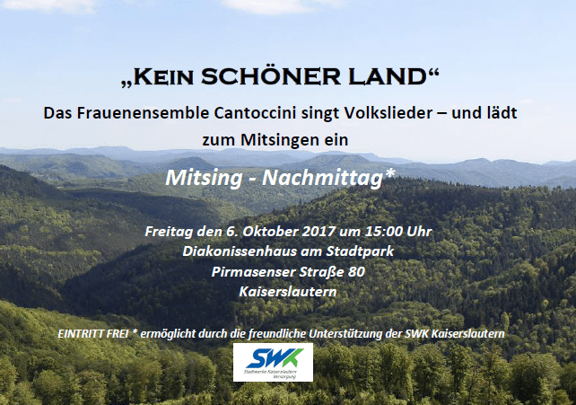 „Kein schöner Land“ Mitsing-Nachmittag am Freitag den 6. Oktober 2017 um 15:00 Uhr im Diakonissenhaus am Stadtpark. Das Frauenensemble „Cantoccini“ präsentiert Volkslieder und lädt zum Mitsingen ein.