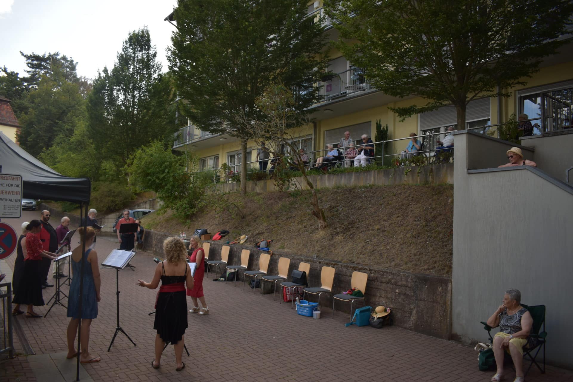 Am Sonntag, den 17. August 2020, präsentierte uns das Vokalensemble „Bella Musica“, bei herrlichem Sonnenschein, einen sommerlich-bunten Melodienstrauß im Hof des Hauses an den Schwarzweihern.