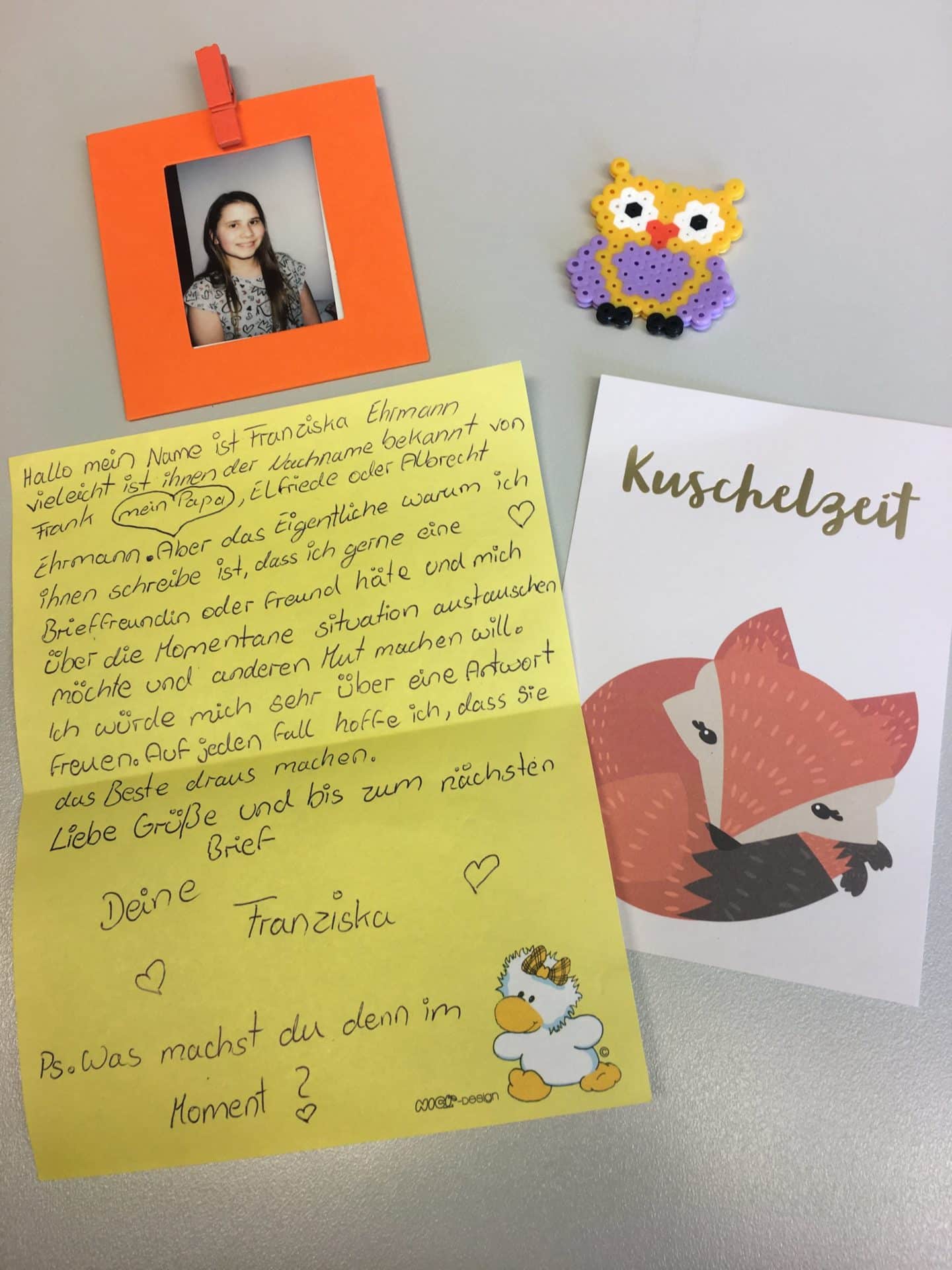Neben vielen aufmunternden und bestärkenden Briefen von Angehörigen berührt uns aktuell eine initiative einer jungen Schülerin besonders: