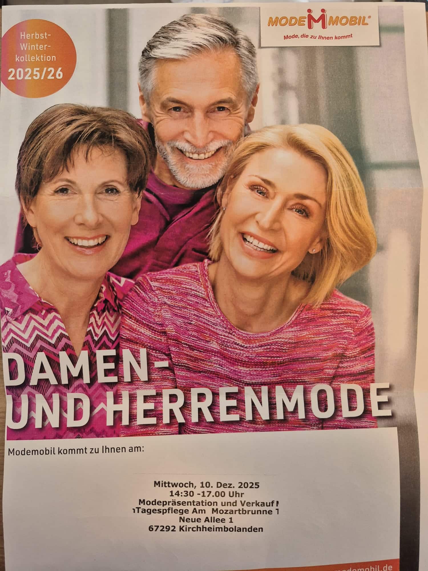 Am 10. Dezember, von 14.30 bis 17:00 Uhr erwartet unsere Tagespflege Am Mozartbrunnen ein besonderes Highlight: MODE MOBIL besucht uns und bringt aktuelle, bequeme und stilvolle Mode für Damen und Herren direkt ins Haus,